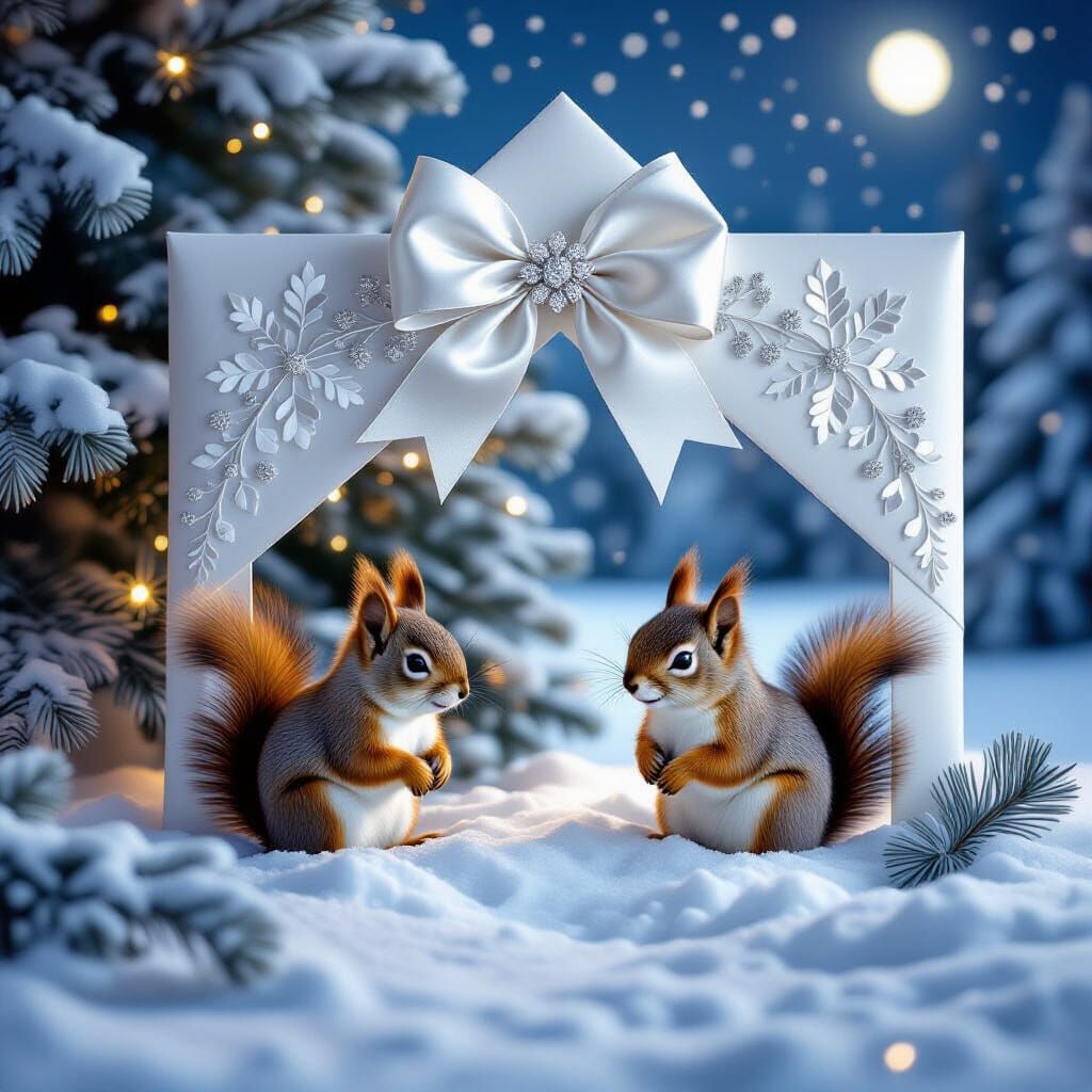 A photorealistic winter fantasy postcard showing squirrels under a decorated Christmas tree on a snowy night, framed by a frosted envelope. Warm, cinematic lighting creates a dreamy holiday atmosphere.