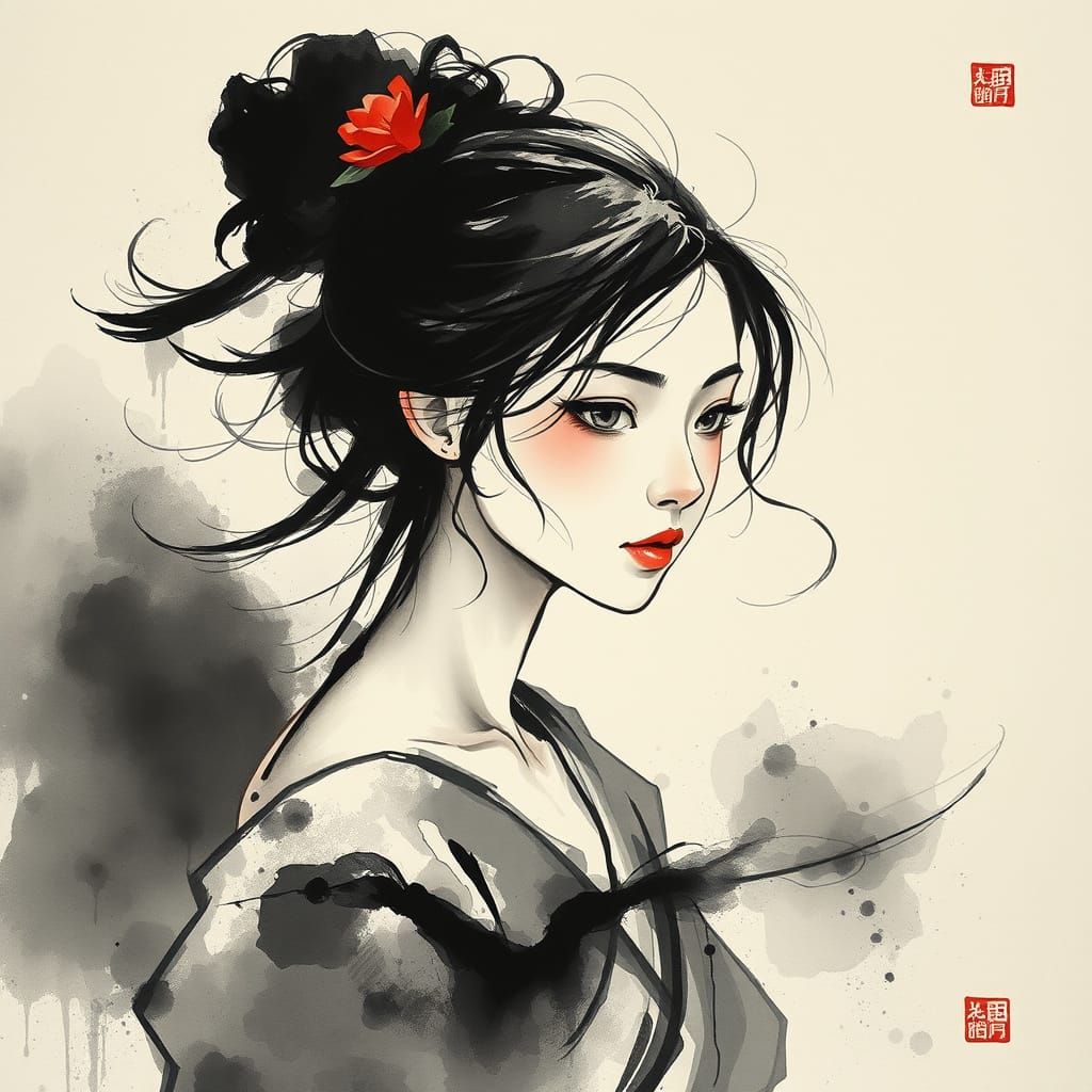 This image features a woman depicted with dynamic ink wash brushstrokes, showcasing stark light and shadow contrasts and subtle ink gradients in an East Asian art style.