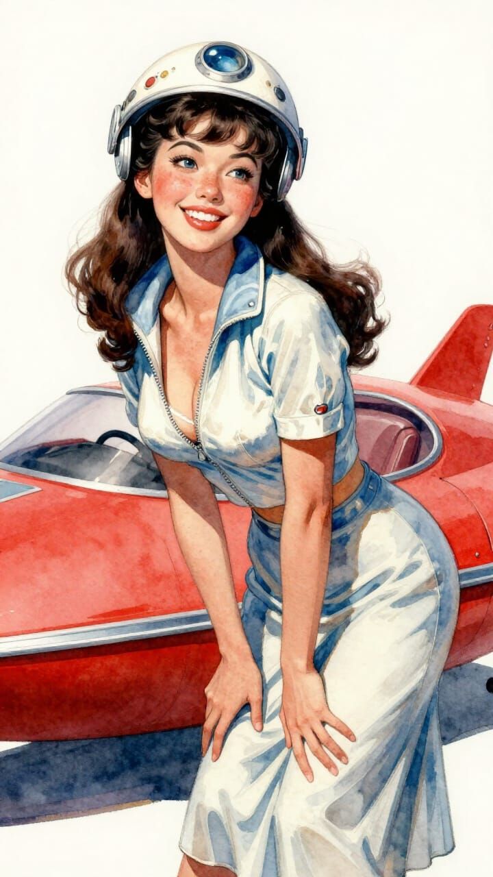 A vibrant watercolor painting in the style of Sargent, featuring a smiling young Asian woman in 1950s space attire beside a retro hovercraft. The image captures dynamic lighting and a sun-kissed complexion.
