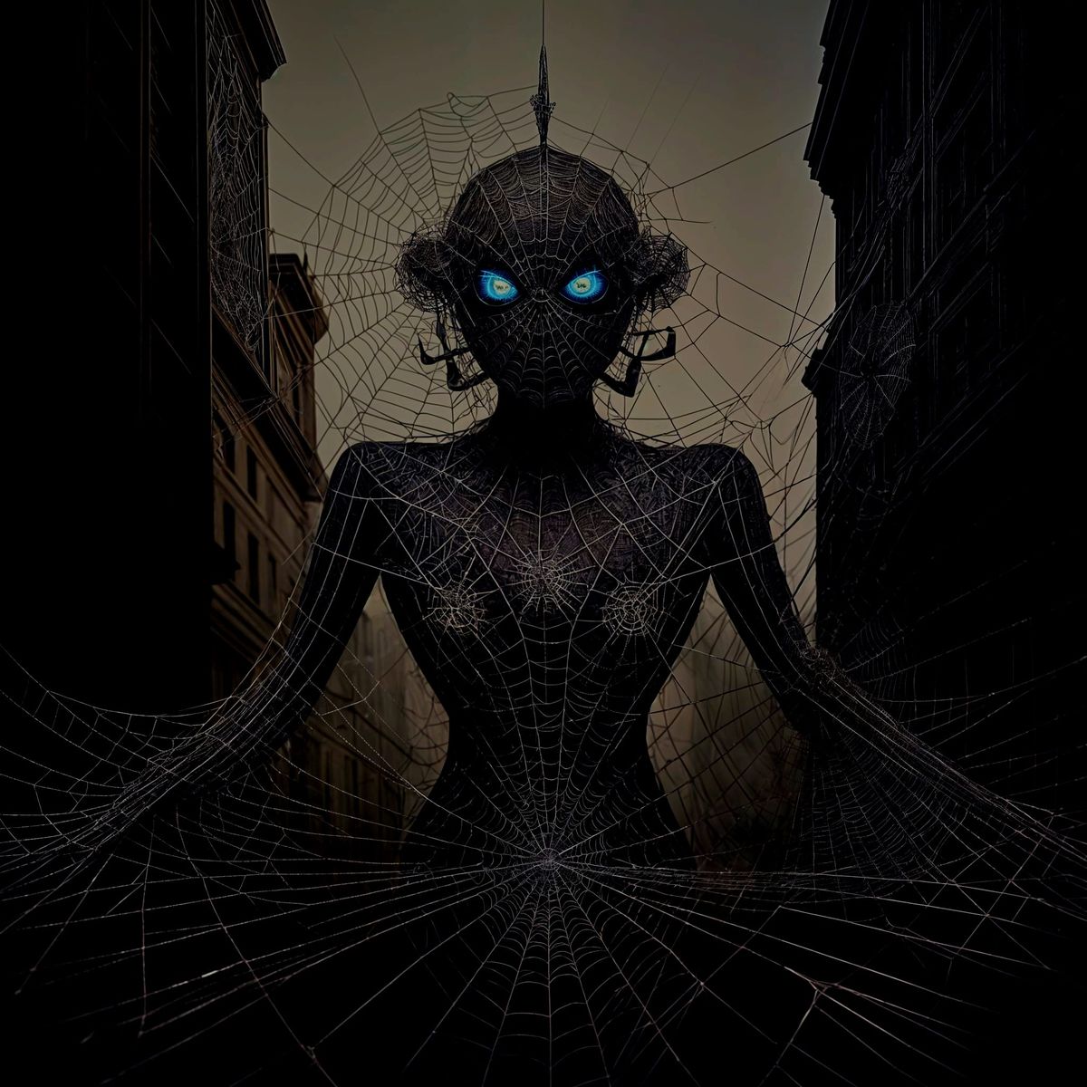 This image presents a surreal double-exposure of a geometric city street at dusk, rendered with dramatic chiaroscuro lighting. The city's architecture subtly transforms into an intricate spiderweb pattern, evoking a sense of uncanny beauty and interconnectedness.