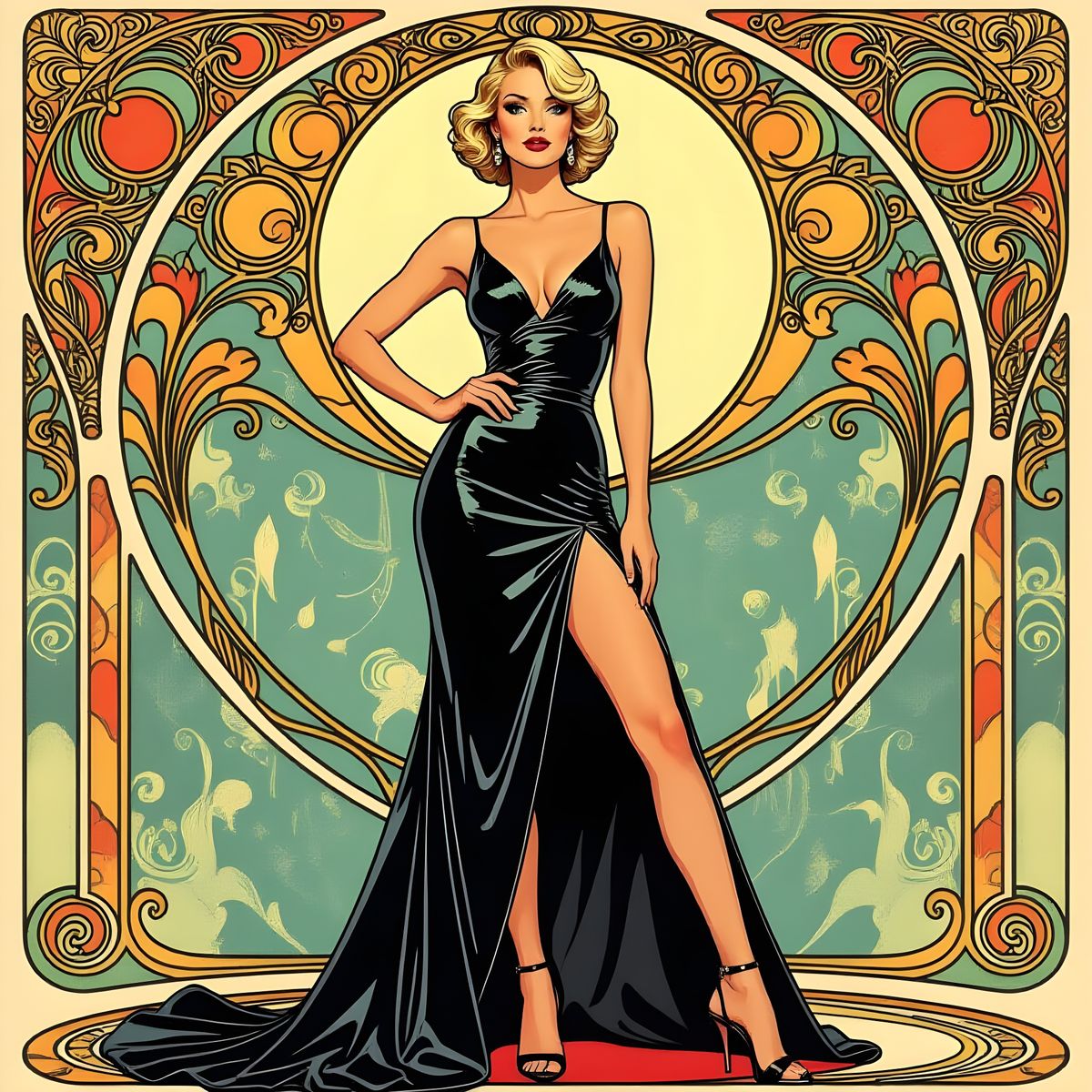 This image features a woman in an elegant, sparkling dress and heels. The photograph captures the subject in a glamorous, high-fashion style.