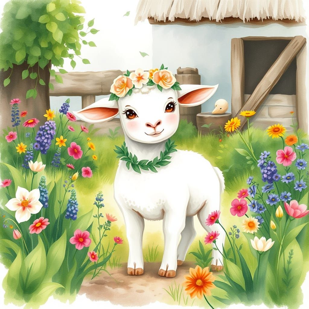 This image shows a happy lamb in a flourishing garden, adorned with a floral garland, set against a quaint rural homestead. The artwork is rendered in watercolor style with soft textures.