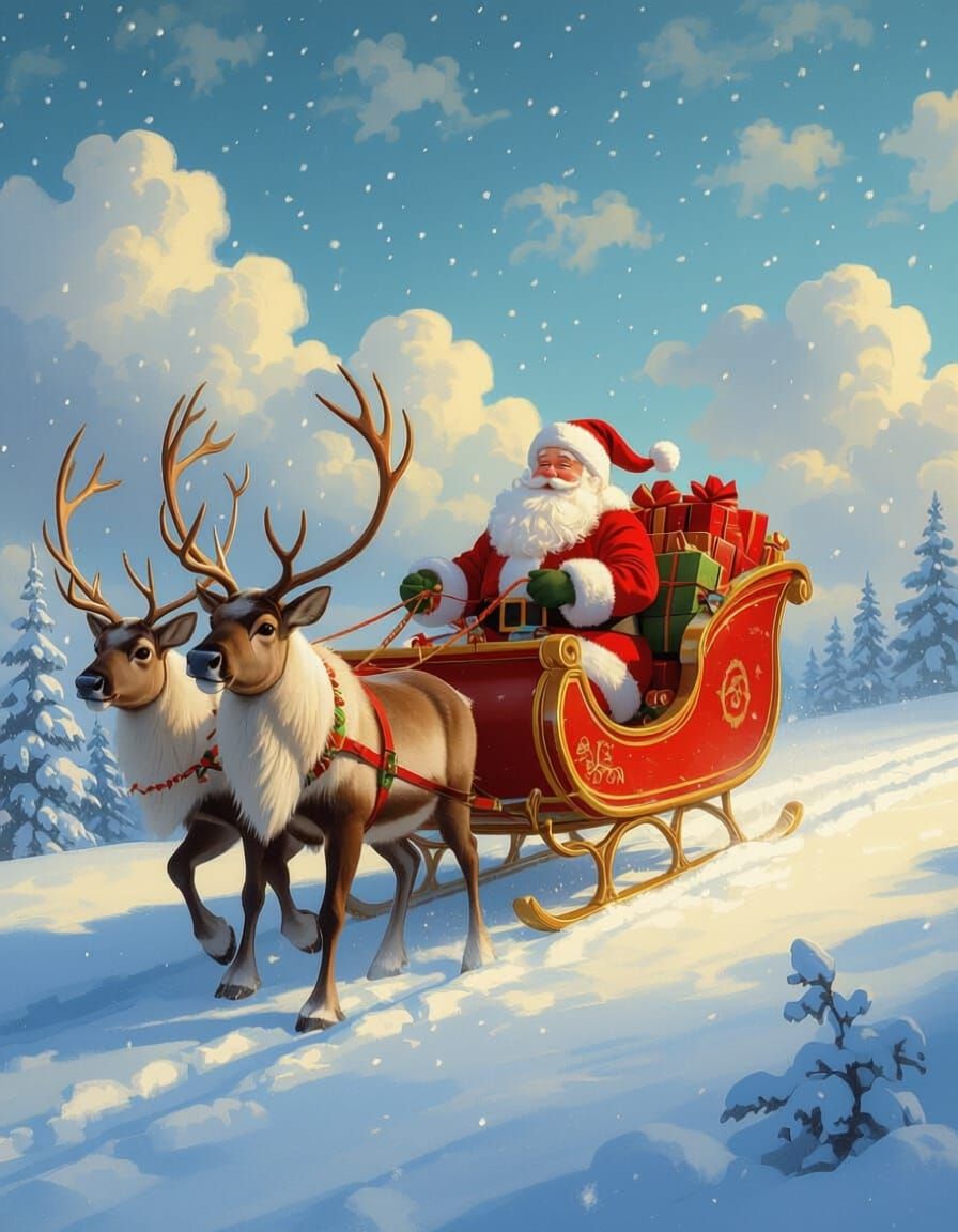 This image shows Santa Claus in his sleigh, pulled by reindeer, soaring through the sky. Santa holds gifts, with Christmas elements visible in the background.