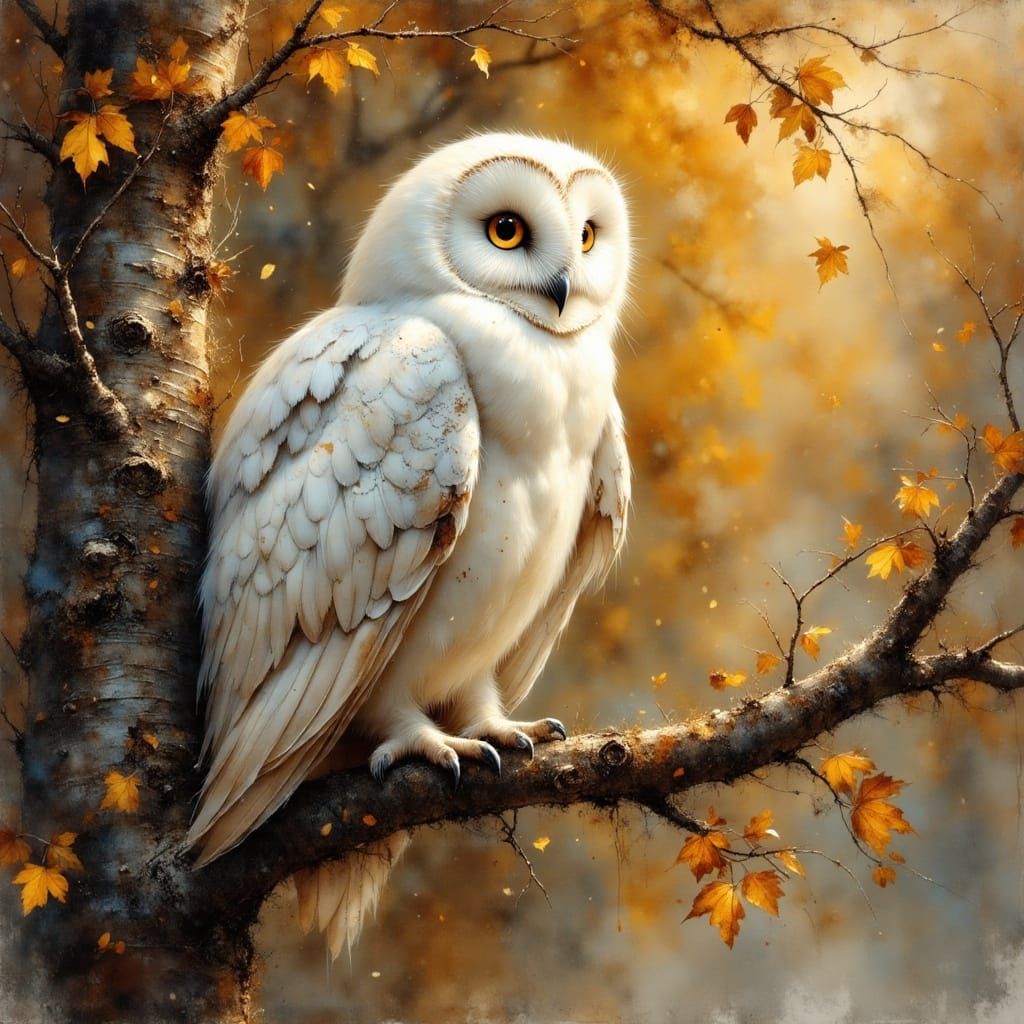 A close-up image of a white owl perched on a tree branch in autumn. The artwork has a distorted, surreal aesthetic and is rendered in an ink sketch style.