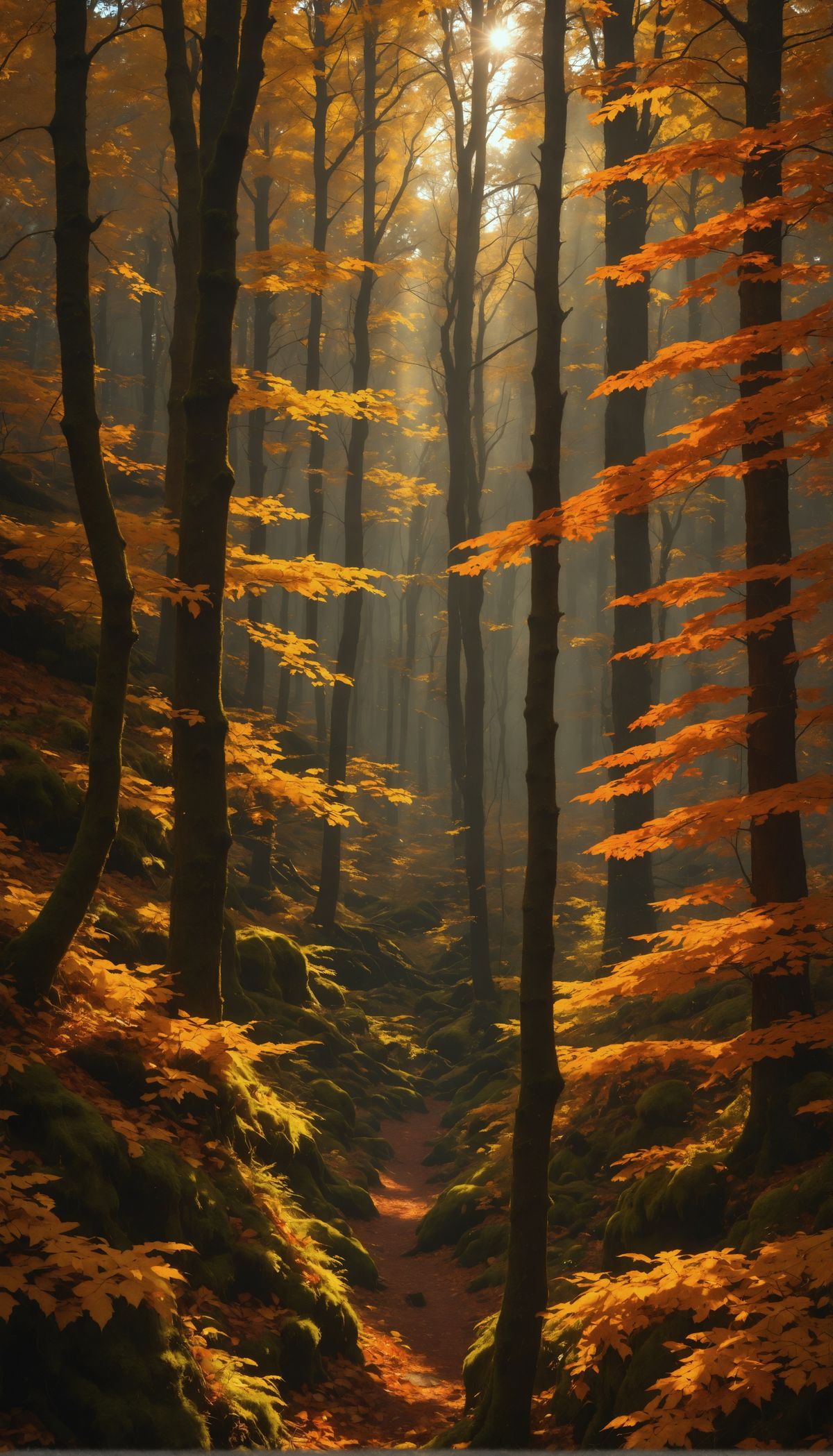 This image shows a sunlit forest scene in peak autumn. The warm color palette and intense detail create an ethereal and fantastical atmosphere in this dynamic composition.