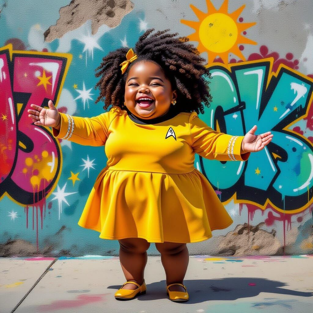 This vibrant image showcases a beaming young Black girl dressed as Lt. Uhura, celebrating National Star Trek Day with joy and sunshine. The art style features bold graffiti and splash art elements.