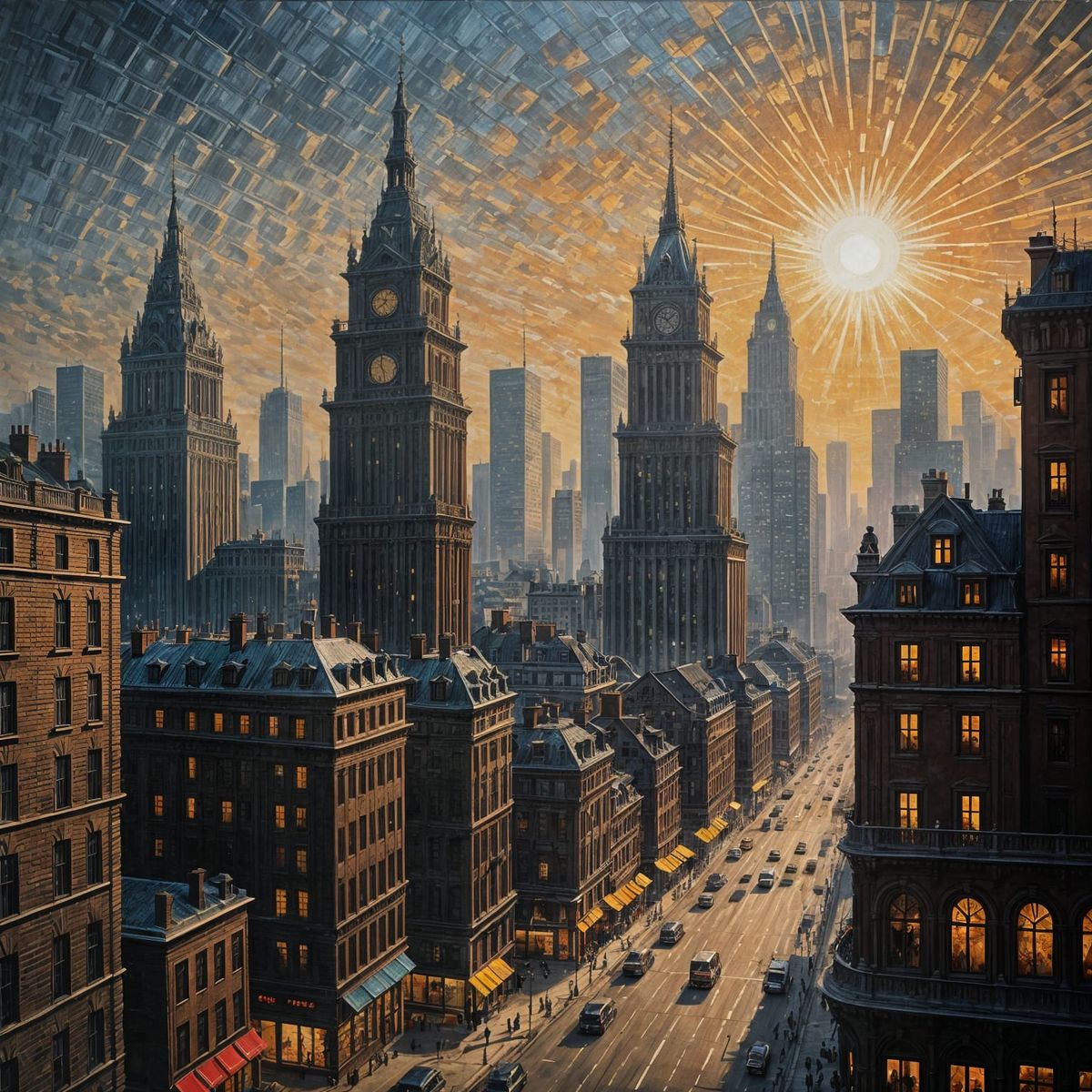 This image is a stunning pastel painting of a cityscape created using a sophisticated three-point perspective technique, showcasing intricate details and vibrant colors.