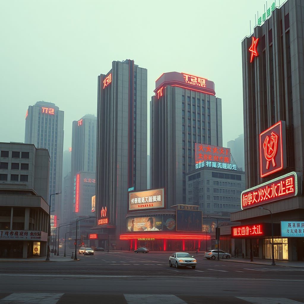 This image shows a dystopian cityscape with imposing concrete high-rises, neon lights, and holographic advertisements, evoking a retro-futuristic dreamscape inspired by Soviet brutalist architecture and vaporwave's nostalgic futurism.