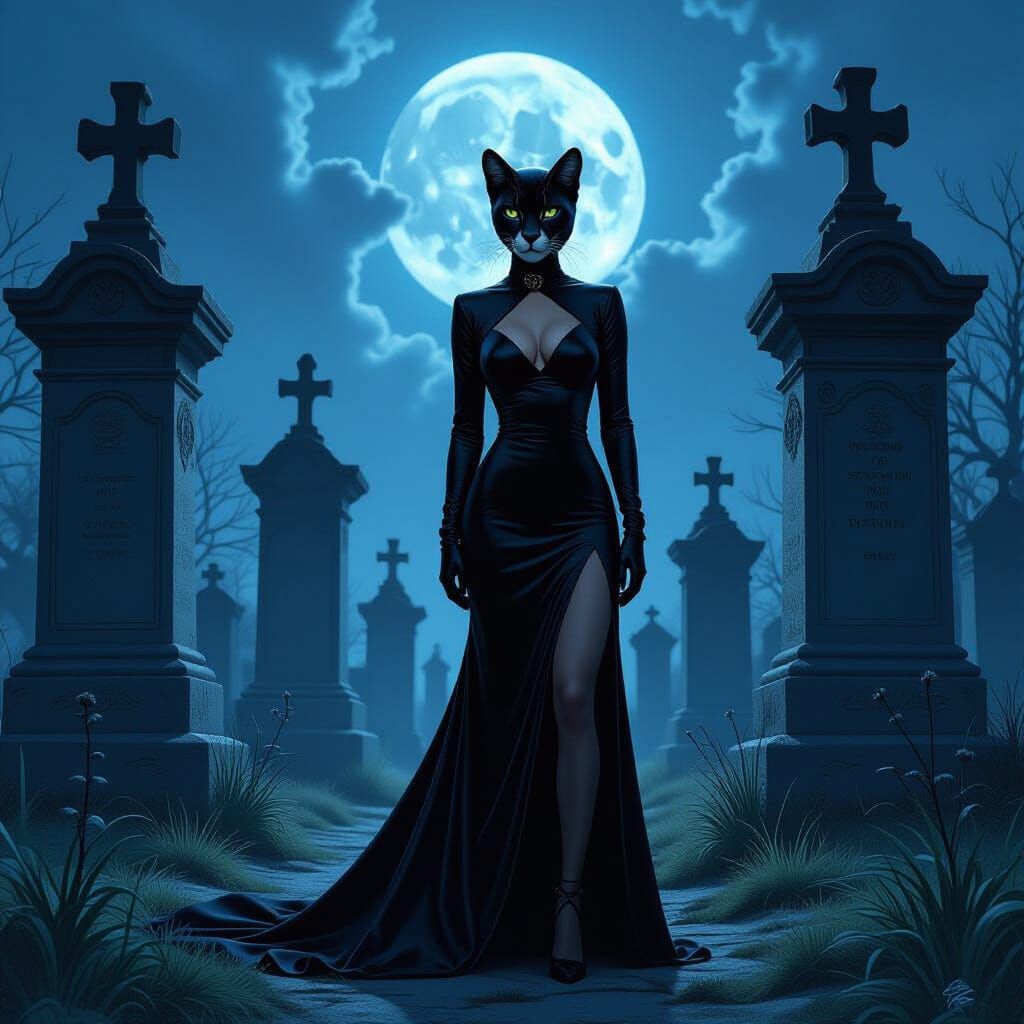 This image features an anthropomorphic cheetah woman in black attire within a gothic cemetery. Dramatic shadows and eerie moonlight enhance the dark fantasy aesthetic, created with digital painting techniques.