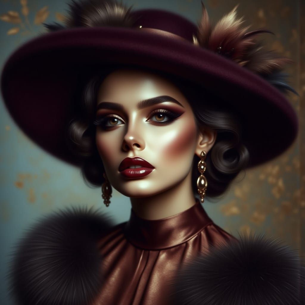 This portrait features an elegant modern lady in a wide-brimmed hat, exuding confidence. Rendered in a contemporary fashion style with soft lighting and a desaturated blue and burgundy palette.