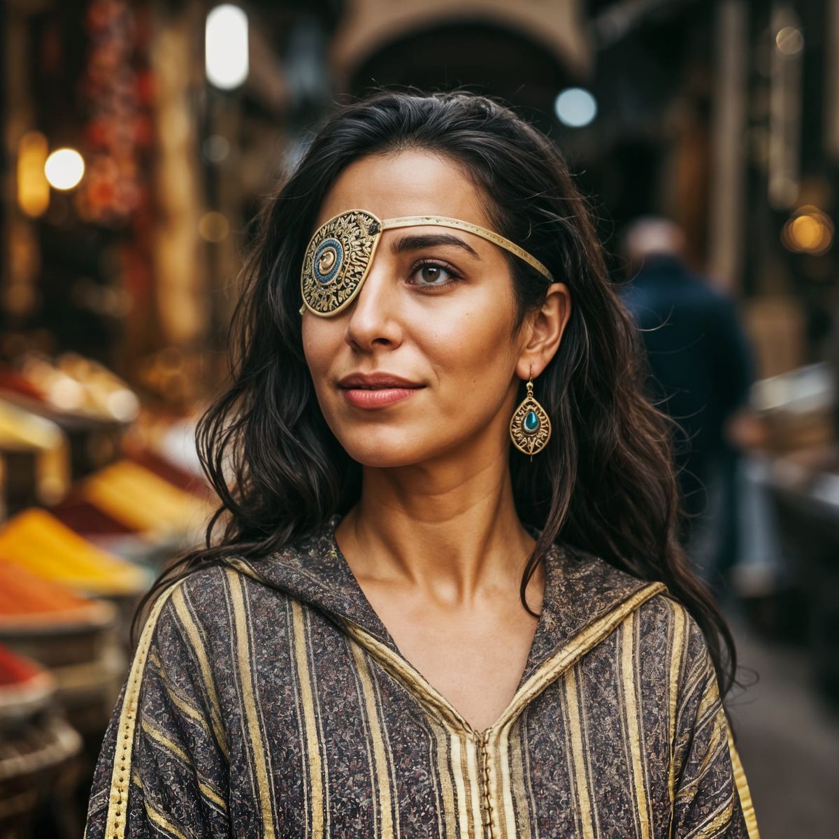 This image captures a serene and contemplative Moroccan woman with an intricately decorated eyepatch, standing in a vibrant Marrakech bazaar. Fine art photography with shallow depth of field and bokeh effect, set against a golden hour backdrop of exotic spices and textiles.