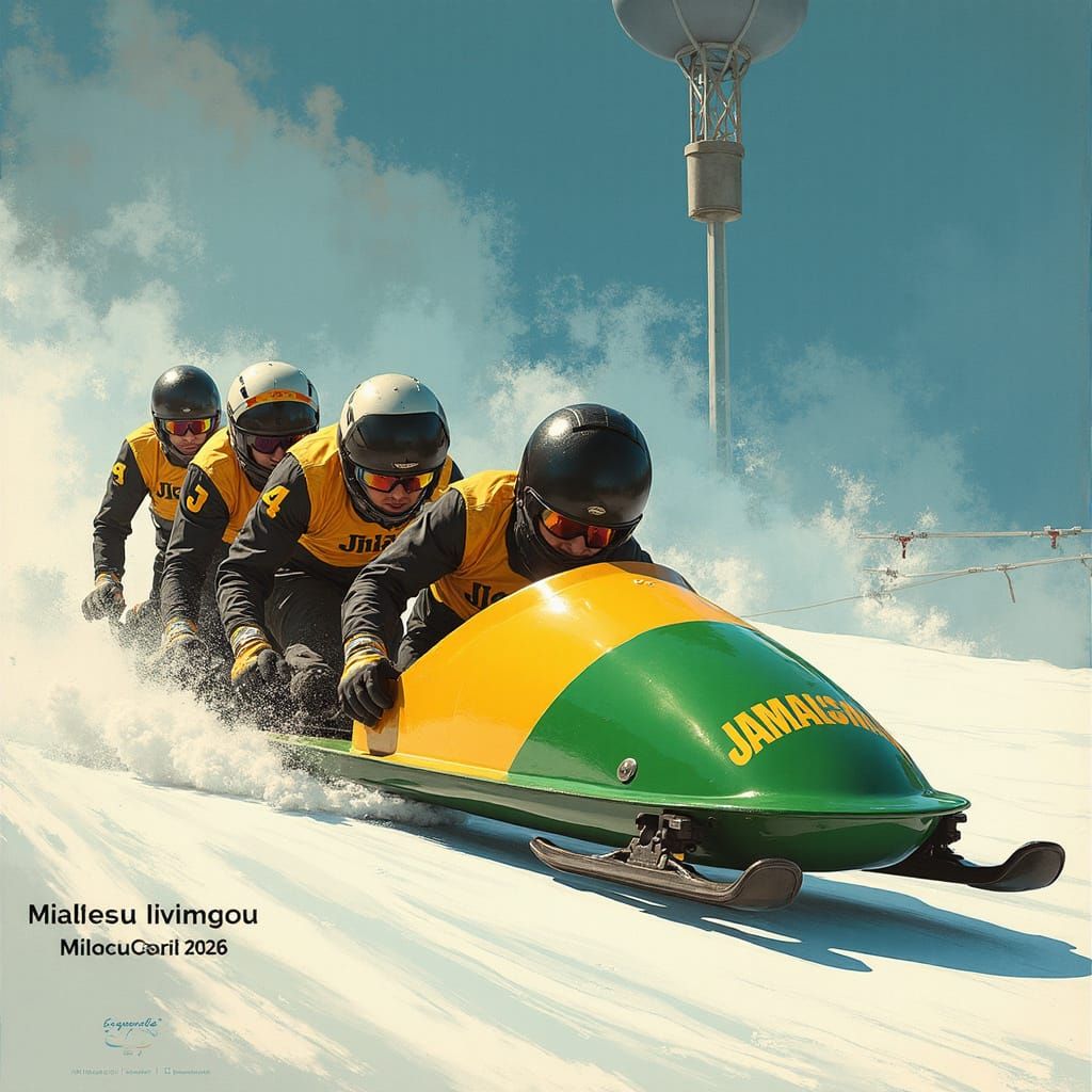This dynamic Olympic poster features the Jamaican bobsleigh team, designed for the Milan-Cortina 2026 games. A vibrant display of winter sports spirit.