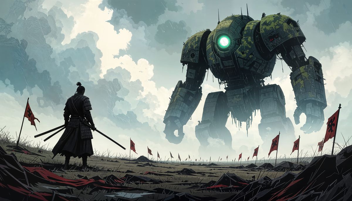 A lone samurai faces a giant, moss-covered automaton on an ancient battlefield. Rendered in a gritty, dark comic art style with dramatic shadows, evoking a sense of foreboding.