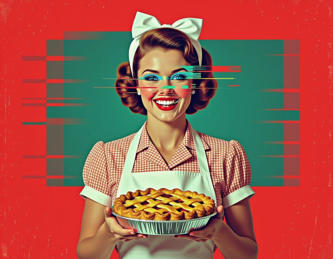 This image shows a distorted portrait of a smiling housewife with glitch effects. The digital art, in a surreal and double exposure style, creates a sinister yet hyperrealistic effect with a glitchcore aesthetic.