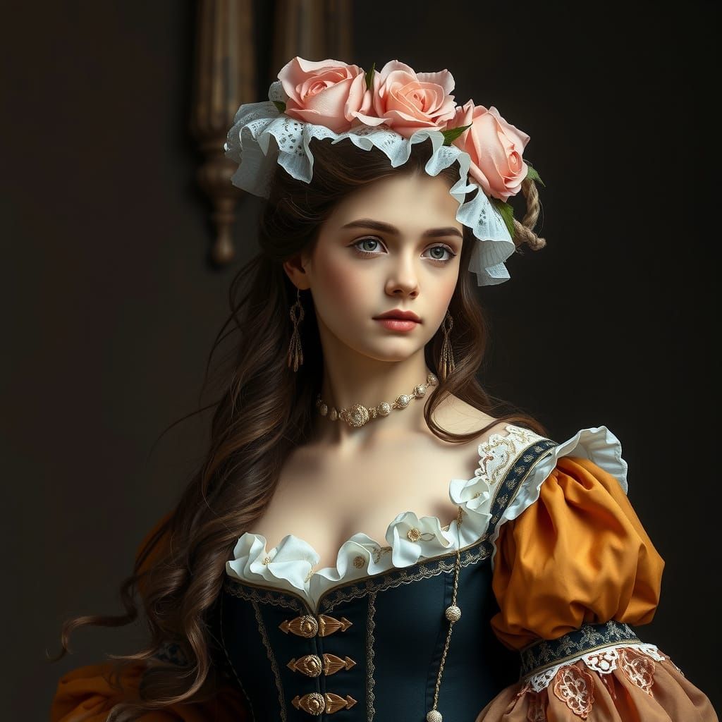 This image shows a young woman in a dramatic pose. The portrait features elements of both Baroque and Gothic styles, creating a dark and elegant aesthetic.