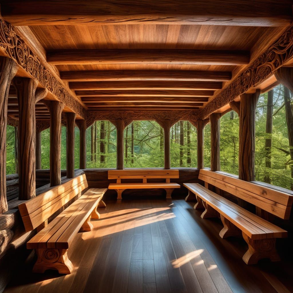 A medium shot of a magical hall featuring benches carved from a single tree. The intricate thorn carvings and climbing vines are highlighted by soft, warm lighting in abstract fractal style.