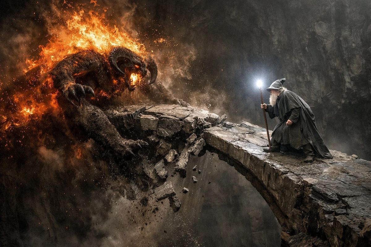 This image depicts Gandalf the Grey confronting a fiery Balrog on a narrow stone bridge over an abyss. The scene captures the dramatic moment the bridge breaks, sending the Balrog falling. Rendered in realistic, uncompressed RAW photo style.