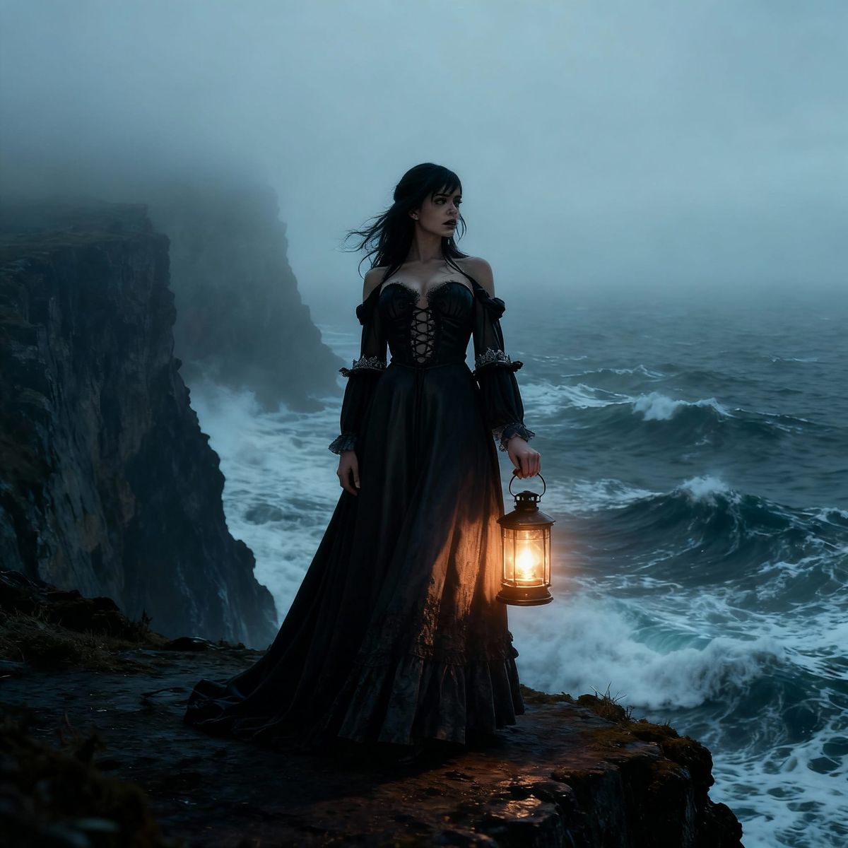 This image shows an elegant woman in a Victorian dress on a cliff overlooking a stormy sea, holding a lantern. The scene features dramatic, shadowy lighting reminiscent of atmospheric horror films.