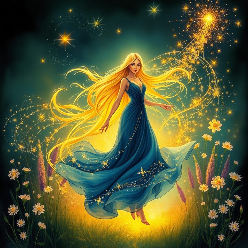 A mystical figure with long golden hair and green-gold eyes glows in a serene deep blue environment, surrounded by blooming flowers and sparkling trails, evoking a sense of ethereal elegance and luminosity.