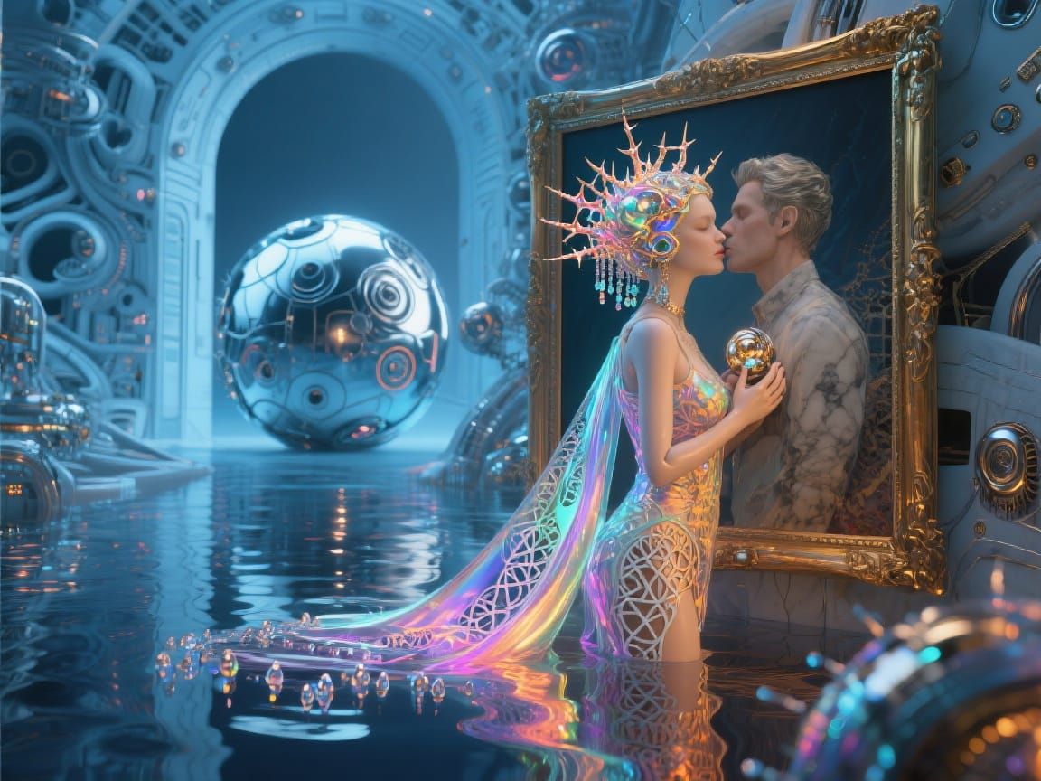 living man image in a framed painting and woman doll outside the painting kissing by glass artist "gilded tenebrism" art deco style living paradigm marbleous afterglow the overall effect is a stunning, 3D chiaroscuro a futuristic fantasy scene with a surreal atmosphere. In the foreground, a masterpiece ...