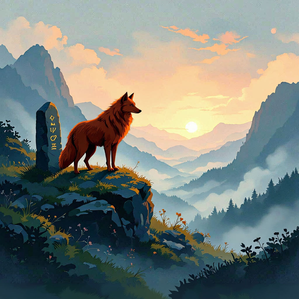 This image shows a lone wolf atop a windswept crag, overlooking a misty valley. The wolf's fur has a twilight hue, blending into the shadows, with ancient runes etched into the stone in a Studio Ghibli aesthetic.