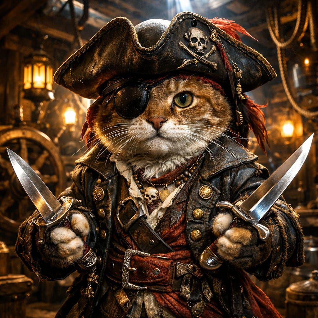 Over-detailed surrealism painting, shining colors, detailed A cat dressed as a pirate, wearing a hat and an eye patch. He is holding two daggers in his hands. Atmosphere is in medieval ship. volumetric lighting, ultra sharp focus, crystal clear, extreme contrast, VFX fine art, ultra CGI rendering, 16K, ...