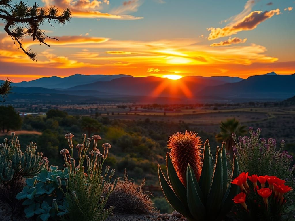 A vibrant sunset over the Jemez Mountains in Santa Fe, New Mexico. The detailed matte painting captures a fantastical view with intricate details and complementary colors, reminiscent of fantasy concept art.