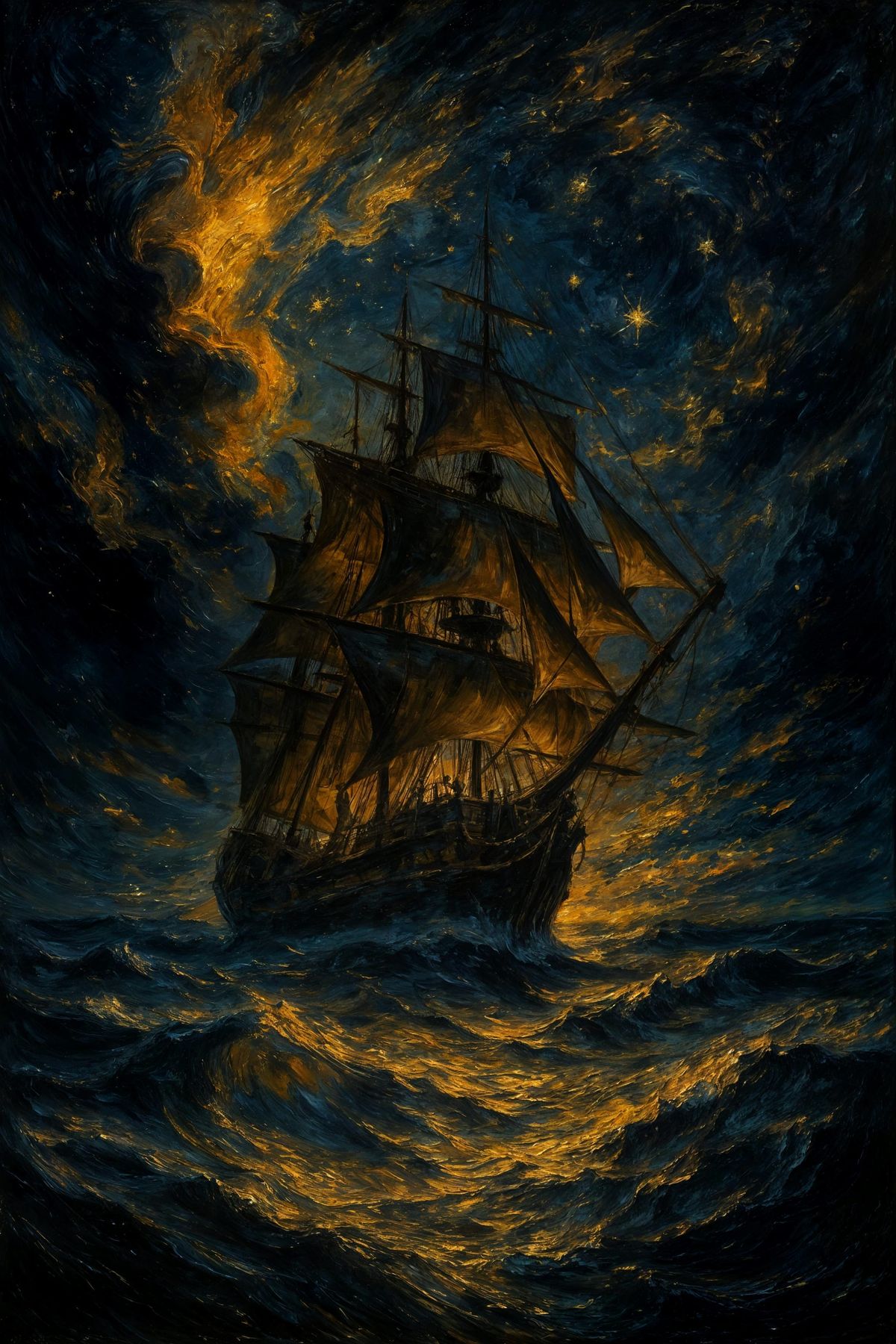 A dramatic oil painting of a galleon sailing a stormy sea at night. The textured waves and dark wood of the ship contrast with a luminous sky in this ethereal scene.