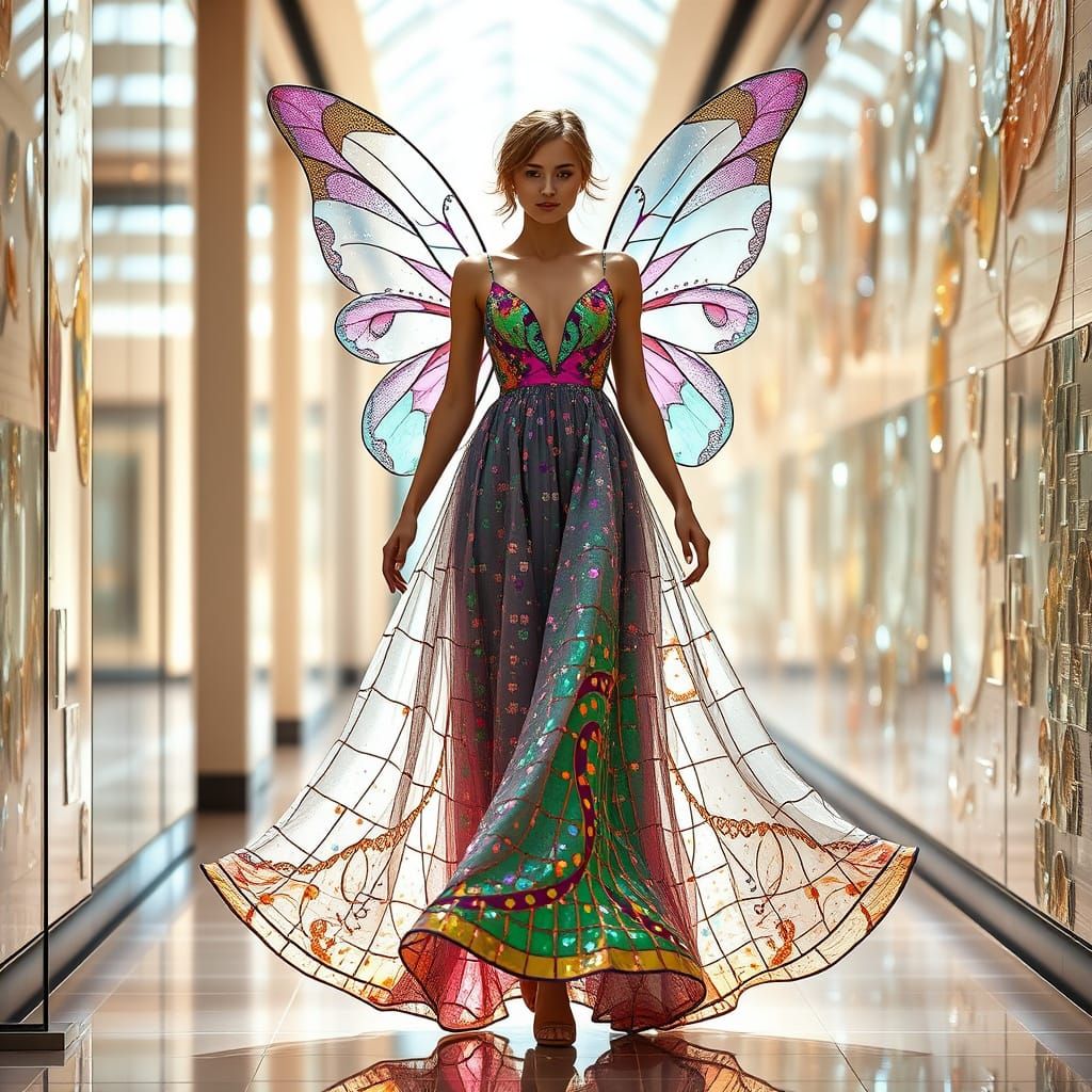 This image captures a fairy walking down a glass art aisle in a stunning, translucent dress with vibrant, sparkling patterns that evoke the beauty of glass mosaics. The dress shines with a magical glow, its delicate straps and flowing hem creating an ethereal atmosphere.