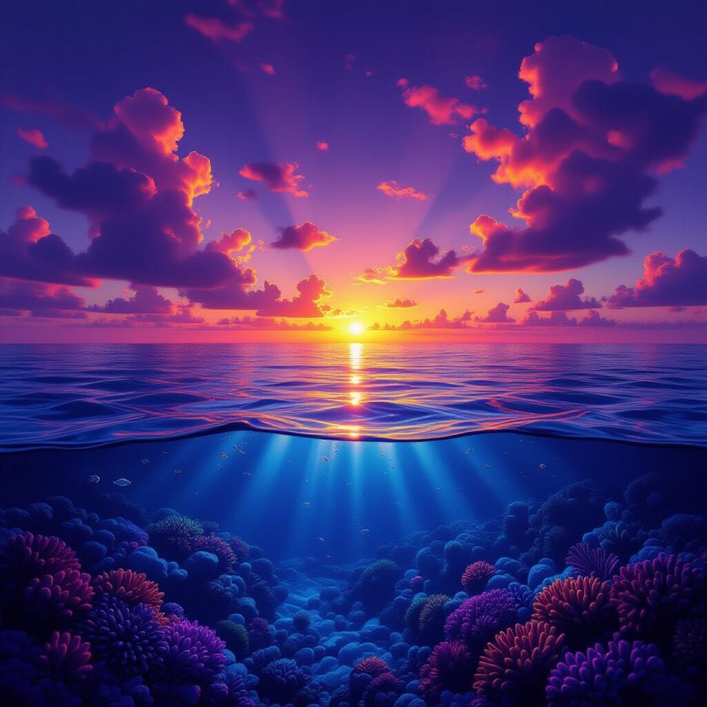 This image depicts a dramatic dark fantasy sunset over the Maldives ocean. Volumetric lighting and vibrant colors create a mystical atmosphere with glowing flora beneath the water's surface.