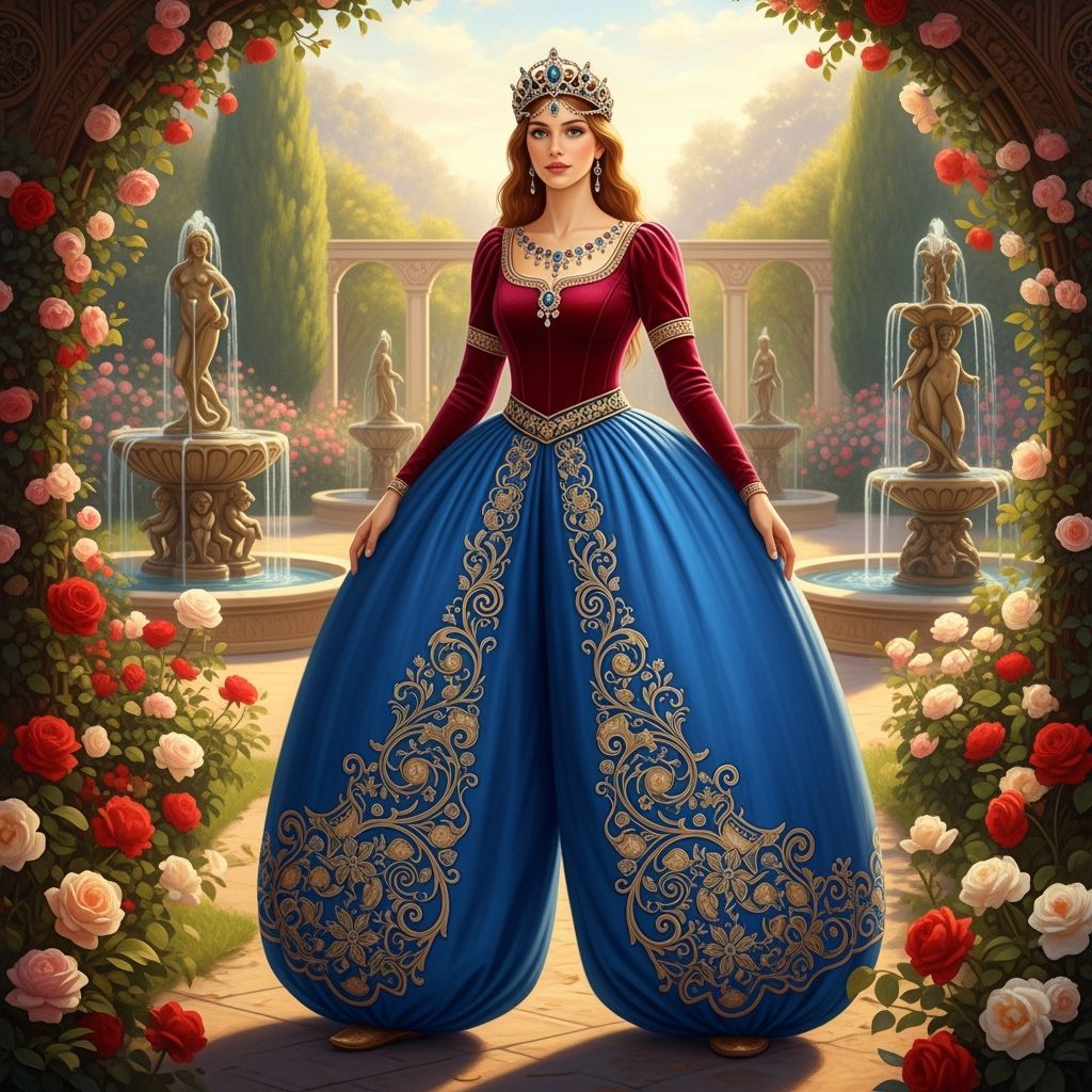 This image shows a princess in voluminous sapphire harem pants with golden embroidery, a crimson bodice, and a jeweled tiara. She stands in a sun-drenched garden with roses and fountains, rendered in a rich, painterly style.
