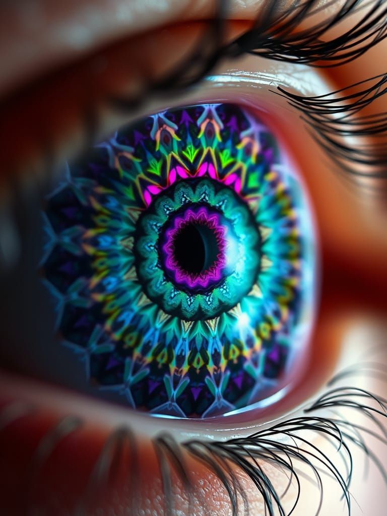 This image shows a macro shot of a human eye where the iris has transformed into a kaleidoscopic mandala. The image features symmetrical patterns and vibrant colors in a psychedelic style.