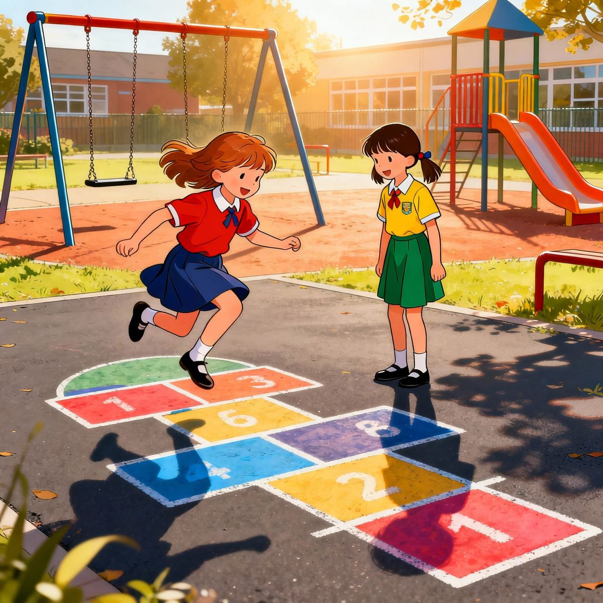 This image shows two girls joyfully playing hopscotch in a bright, sunlit school playground. Rendered in a cheerful illustrative style with bold outlines and saturated colors, reminiscent of classic children's books.