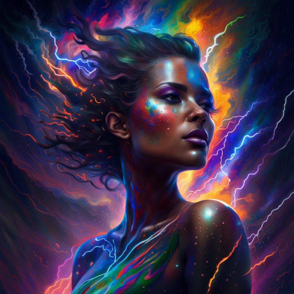 This image shows a beautiful woman with colorful body paint standing against a backdrop of a space thunderstorm, rendered in a hyperdetailed solarpunk aesthetic.