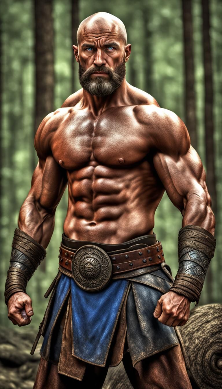 A photorealistic image of a muscular, shirtless warrior with a beard and a crooked Roman nose, standing in a forest. The digital rendering features HDR and a 3/4 body view.
