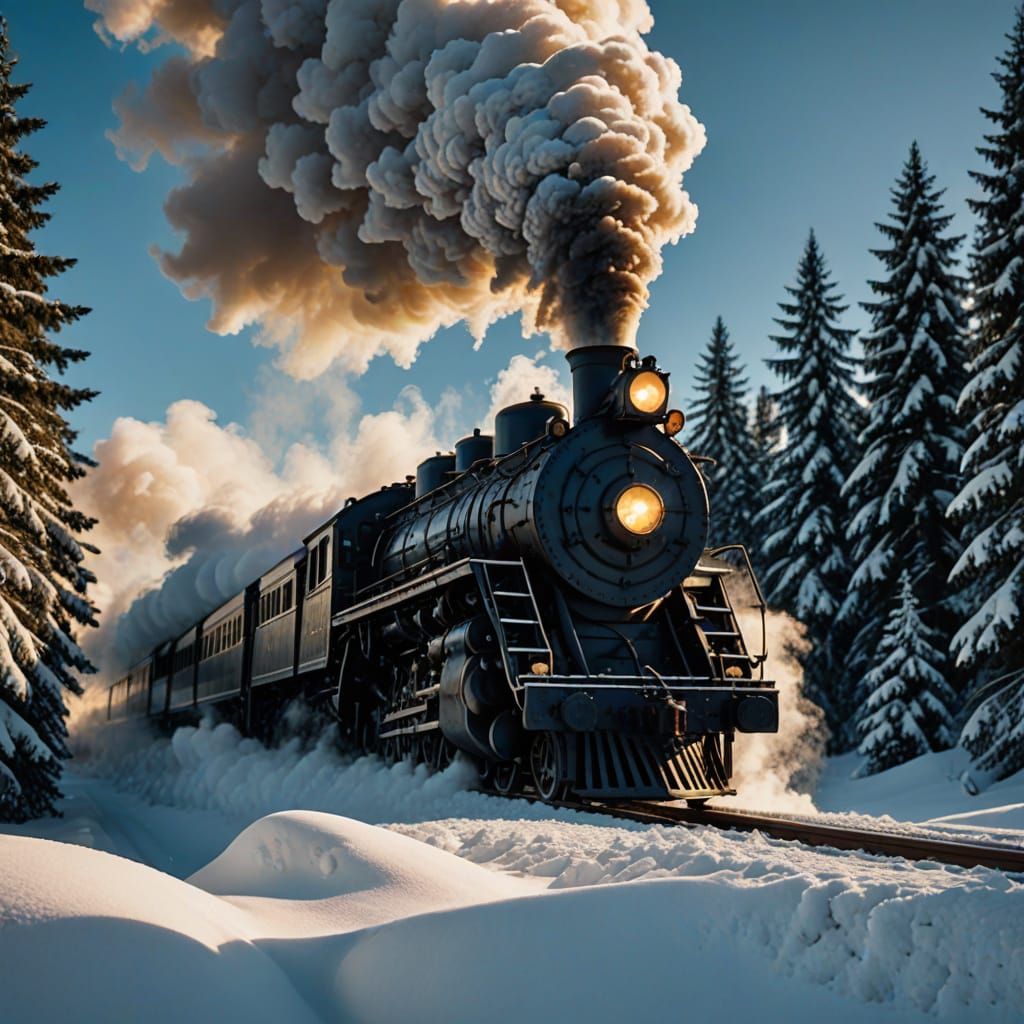 A hyper-realistic cinematic image of a vintage steam train moving through deep snow. Golden smoke billows from the dark metallic engine, contrasting with the blue sky. Warm light illuminates the snow.