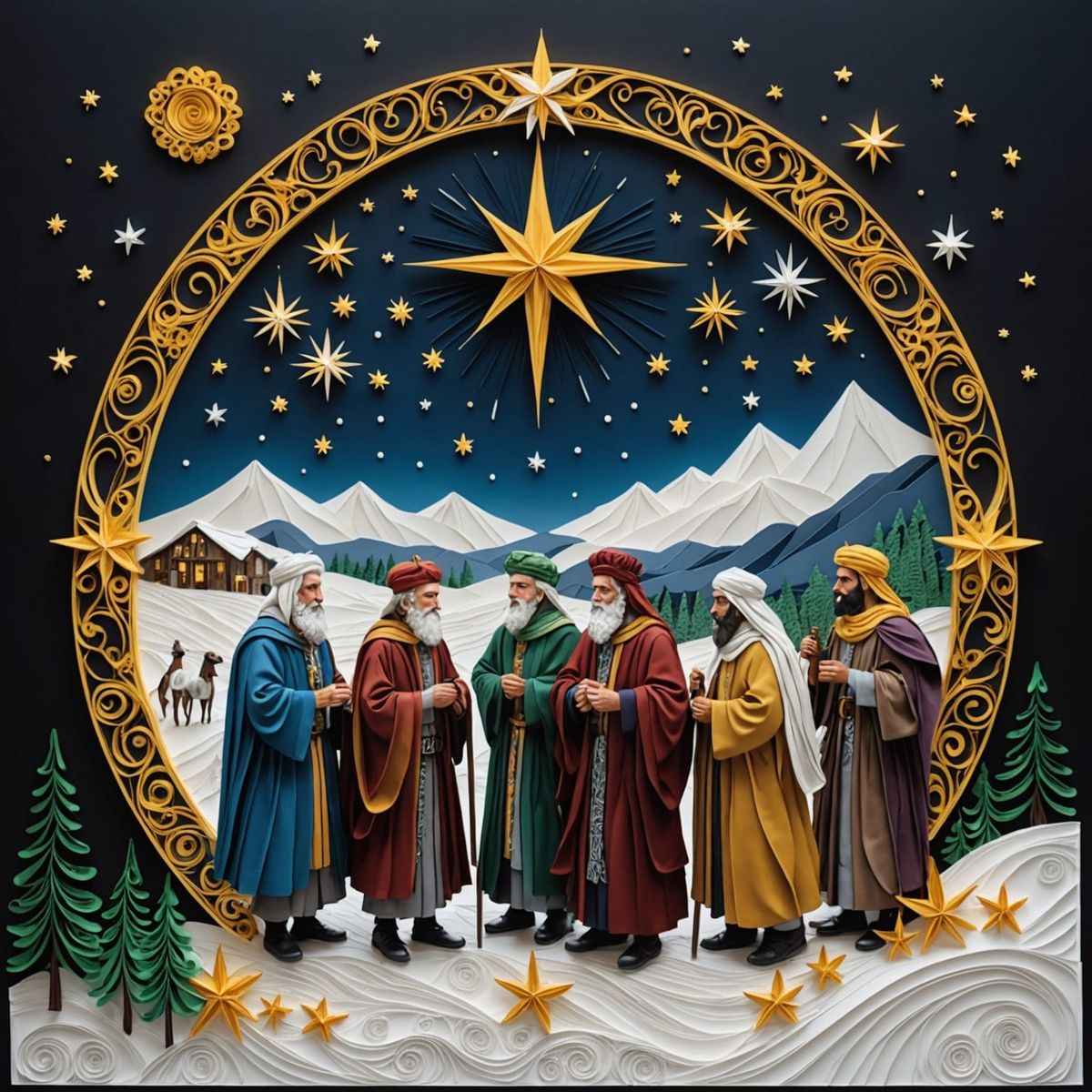 This image depicts the biblical scene of the three wise men following the Star of Bethlehem. Created as hyper-detailed quilling collage art with dynamic lighting.
