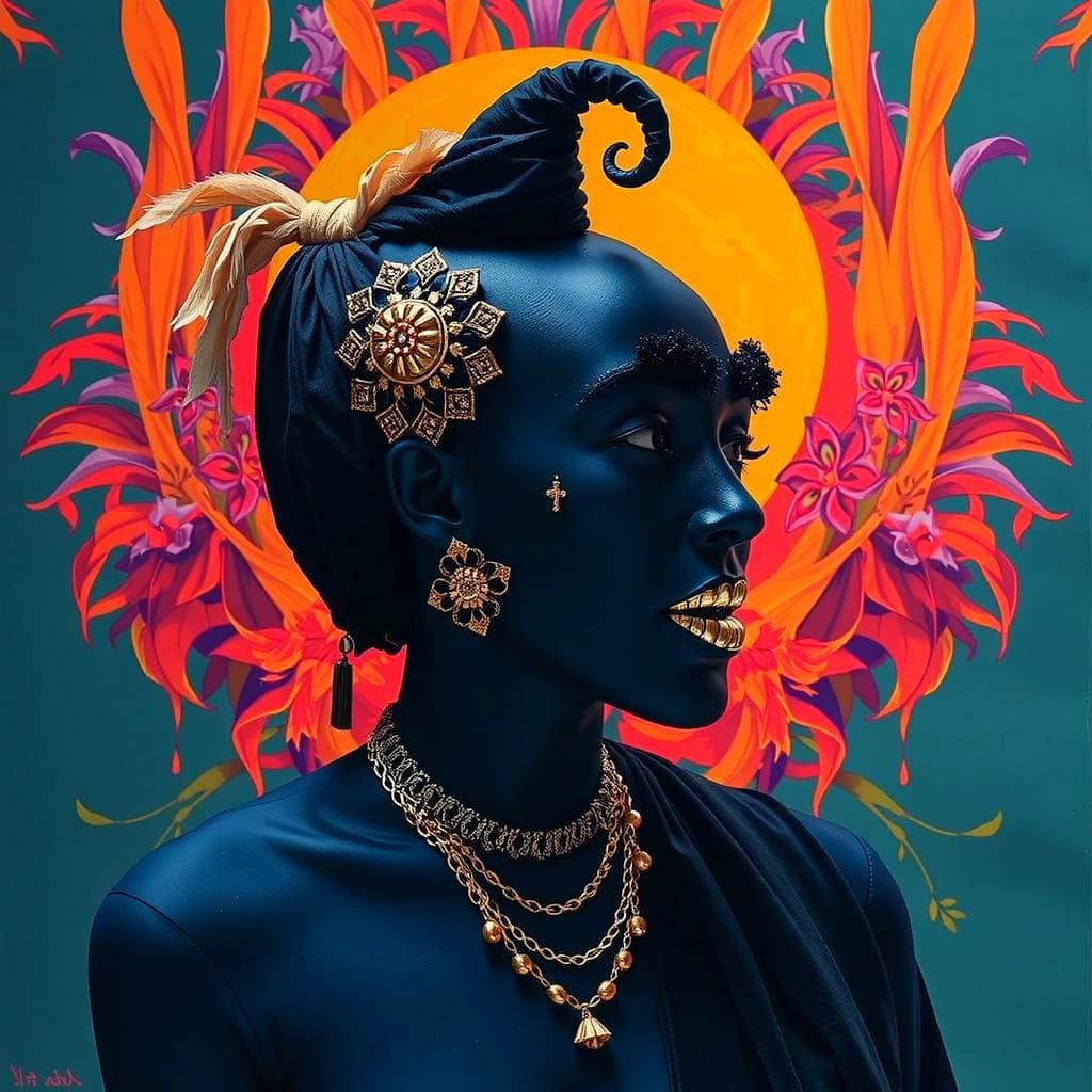 This image features a vibrant background with psychedelic floral and abstract motifs in bold oranges, reds, purples, and greens. It blends tropical heat with cosmic mystery, set against a deep blue bodysuit with shimmering gold accessories.