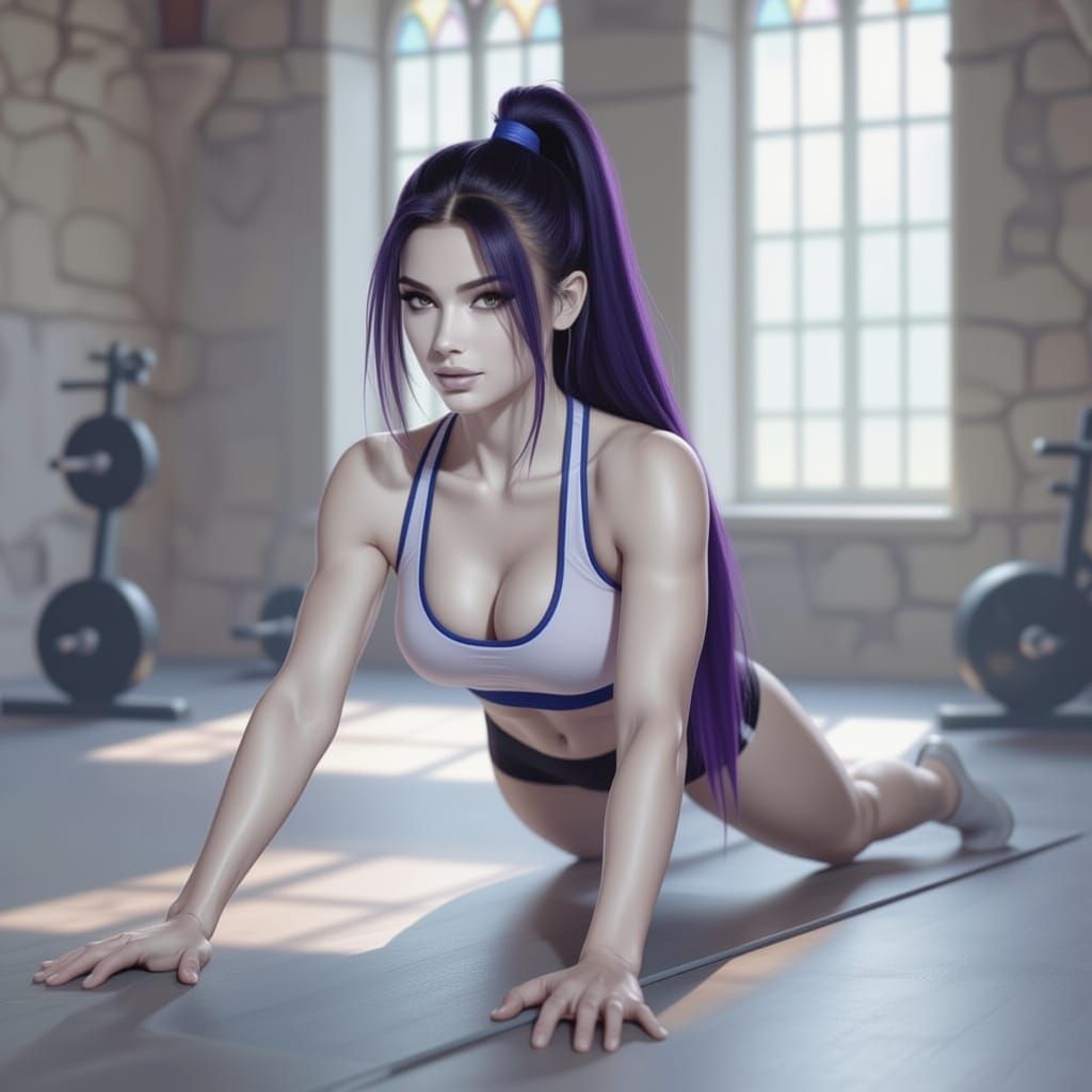 This image shows a young woman with long black hair and violet streaks doing weight training in a gym. She is lifting dumbbells, wearing a sports bra and shorts, with an athletic yet graceful physique in an ultra-realistic style.