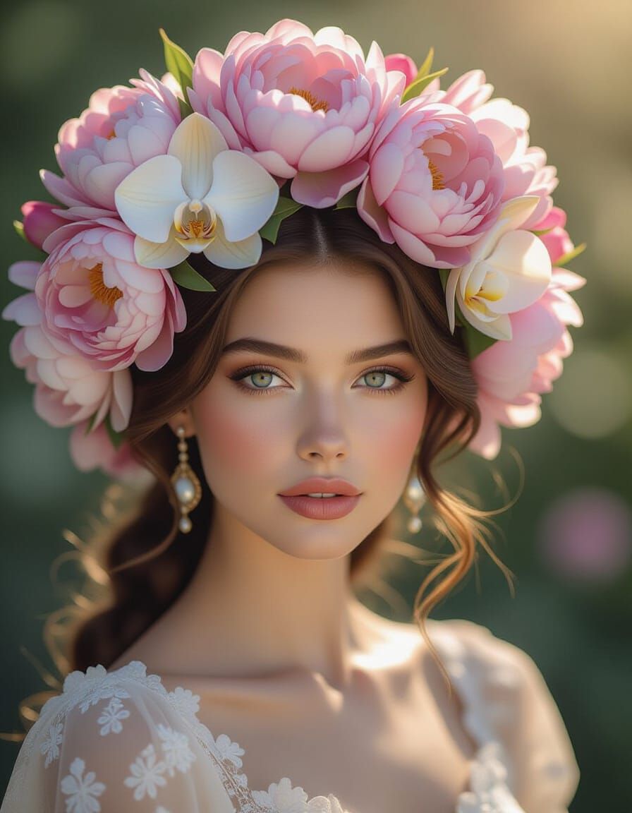 Close-up portrait of a woman with a floral headdress made of peonies and orchids