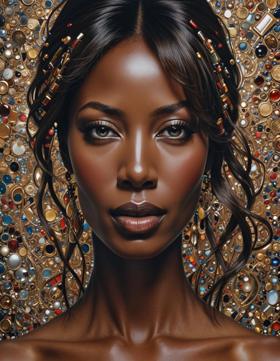 This image shows a hyperrealistic portrait of a beautiful woman. The woman's face is a blend of Naomi Campbell and Christy Turlington, set against a deep, maximalist background.
