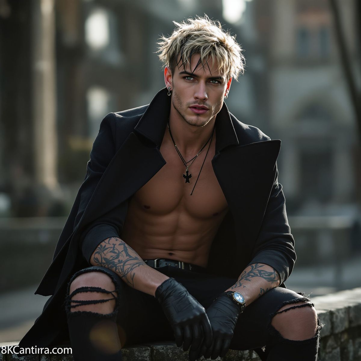 This highly detailed, photorealistic image captures a young man with striking blue eyes and dark blonde hair with black streaks, sitting on a stone wall. Cinematic lighting and a shallow depth of field enhance the dramatic scene.