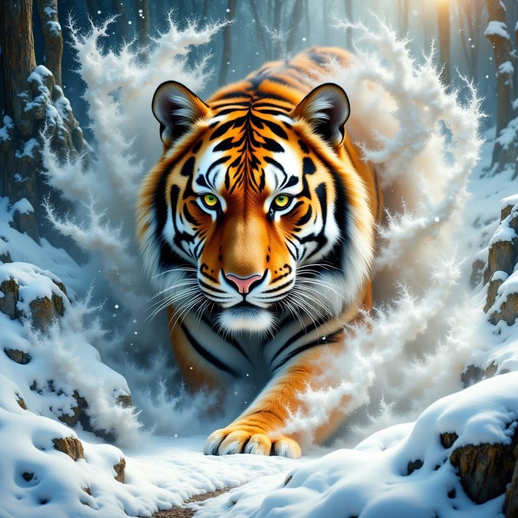 This image depicts a majestic Siberian tiger rising from a snowstorm, its vibrant orange-gold fur and piercing green eyes illuminated by soft winter light, set against a backdrop of delicate snowflakes and swirling vortex, reminiscent of intricate, dreamlike landscapes.