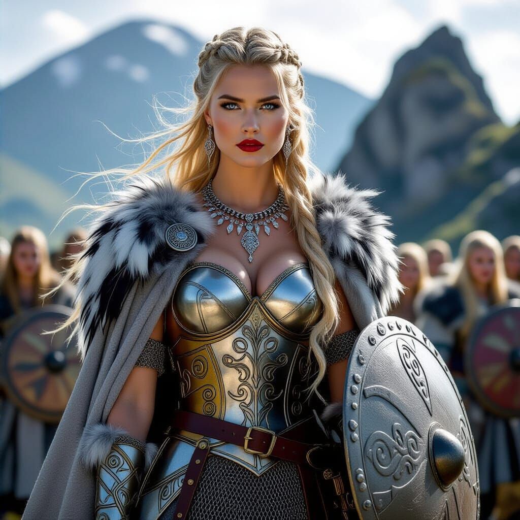 This image shows a striking goddess with long blonde hair and ice-blue eyes, adorned with a silver necklace and gold corset armor. She stands on a rock with Viking warriors in a cinematic style.