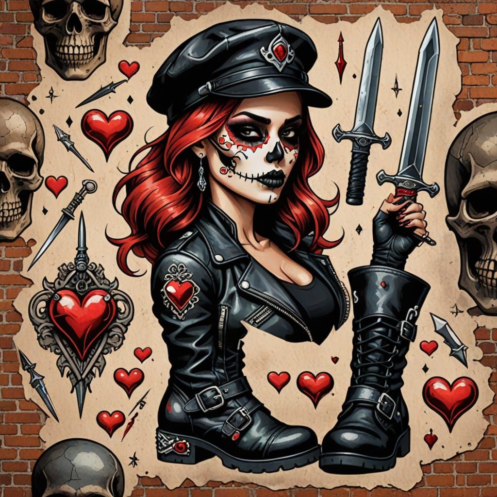 This image showcases a flash tattoo sheet with female jewel thief designs. It presents vibrant, bold tattoo art against a distressed brick wall, creating an edgy, urban aesthetic.