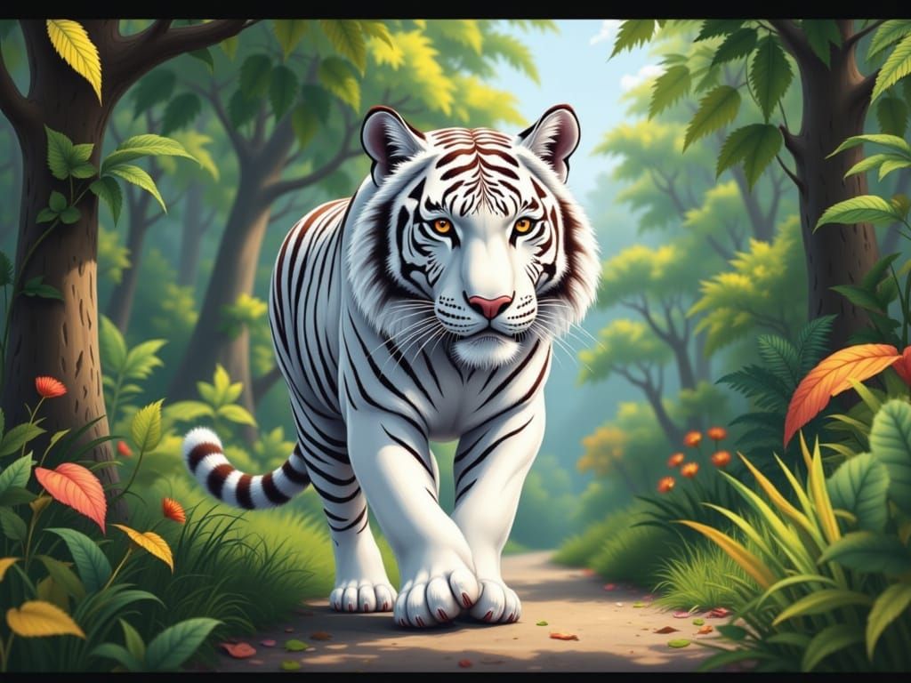 This image shows an animated, colorful white tiger walking through a jungle. The art style blends realistic detail with anime aesthetics.