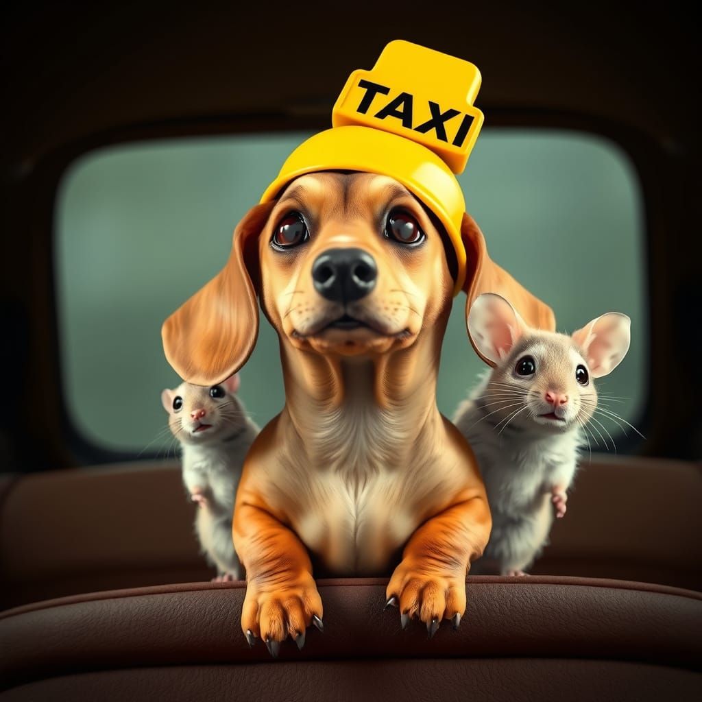 This image shows an extremely long dachshund wearing a taxi hat. The dog looks surprised while carrying two happy mice. The image is rendered with realistic textures and lighting.