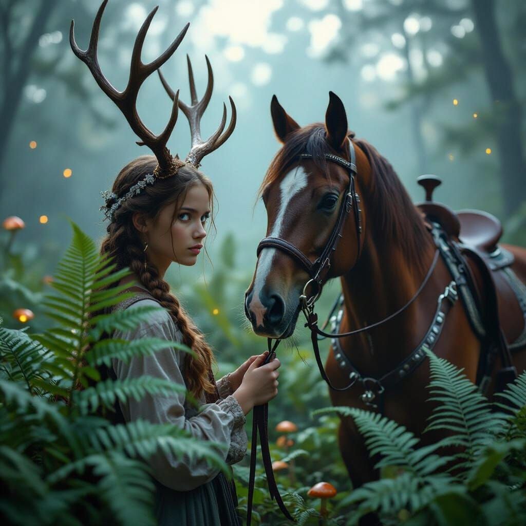 This hyperrealistic image depicts a girl with deer antlers and a majestic Tinker horse in a misty swamp. Fireflies and glowing mushrooms illuminate the twilight scene, creating a cinematic atmosphere.