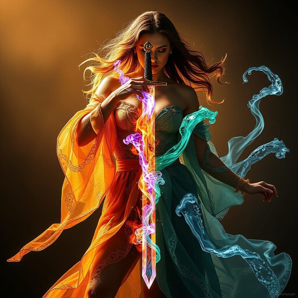 This image shows a majestic, otherworldly woman magician wielding a sword with opposing elements of fire and water, set in a surrealistic scene with dreamlike atmosphere and hyper-detailed textures.