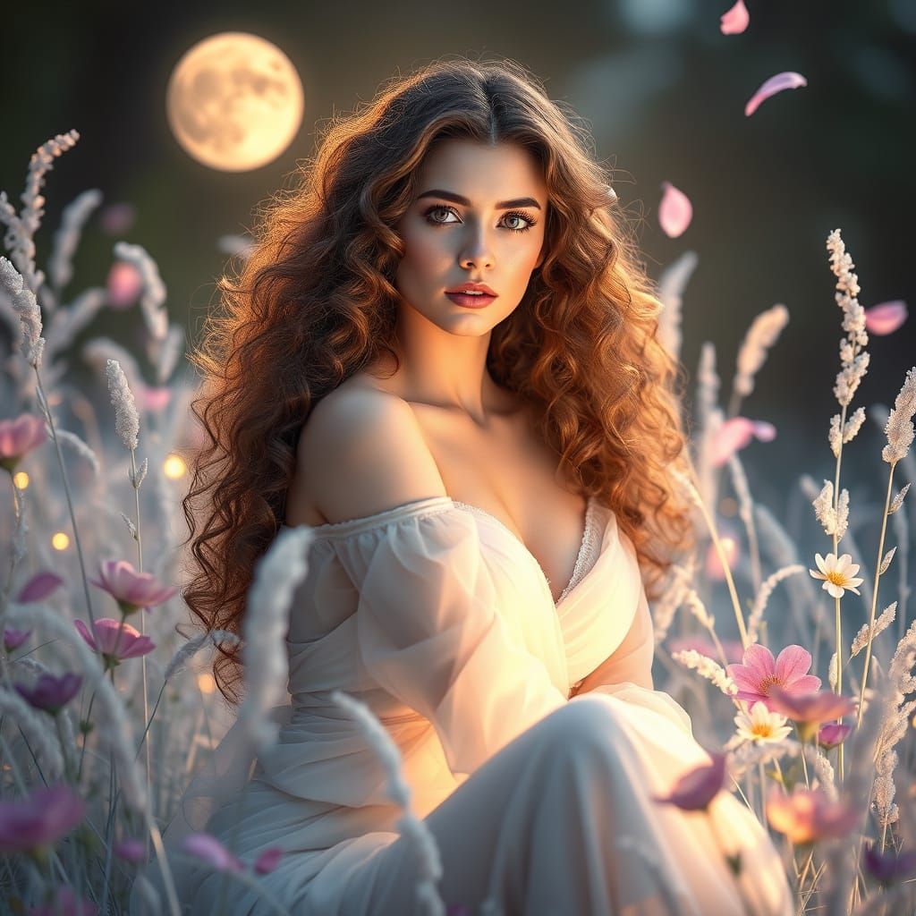 A digital image of a celestial being with long, curly hair and radiant skin in a moonlit garden. The figure is adorned in soft, flowing clothing, set against a backdrop of crystal florals and shimmering light in a romantic fantasy style.